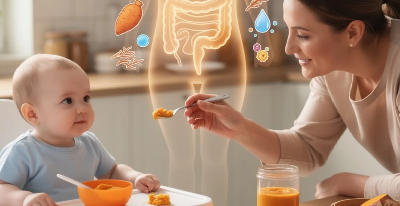 Pour comprendre en quoi la patate douce peut aider un bébé constipé, il est utile de se pencher sur le fonctionnement des fibres dans l’intestin immature du nourrisson. Chez les tout-petits, le système digestif est encore en construction : la motricité intestinale est plus lente, la flore intestinale moins diversifiée et la muqueuse plus fragile. Les fibres de patate douce, par leur structure et leur composition, vont agir à plusieurs niveaux : elles stimulent mécaniquement le transit, retiennent l’eau dans les selles, nourrissent certaines bactéries bénéfiques du microbiote et influencent le temps de passage des matières dans le côlon.