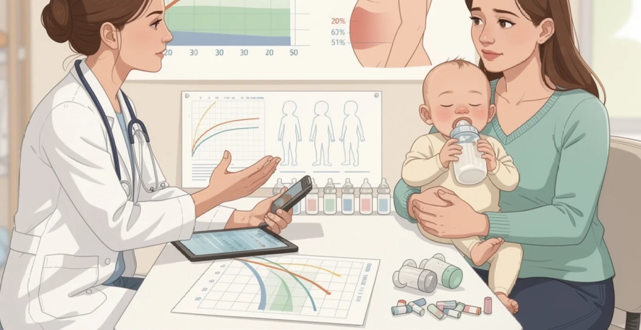 Un bébé qui reste autour du 10ᵉ percentile de taille et du 10ᵉ percentile de périmètre crânien, avec un poids entre le 10ᵉ et le 25ᵉ percentile, a probablement trouvé son « canal de croissance » en fonction de son patrimoine génétique. En revanche, une cassure nette de la courbe (par exemple, un passage rapide du 50ᵉ au 3ᵉ percentile) impose de s’interroger sur d’éventuels apports alimentaires insuffisants, une pathologie intercurrente ou un trouble digestif. C’est pourquoi les mesures régulières lors des consultations de suivi (en général tous les mois la première année, puis tous les 2–3 mois) sont si précieuses pour évaluer si votre bébé mange assez sur le long terme.